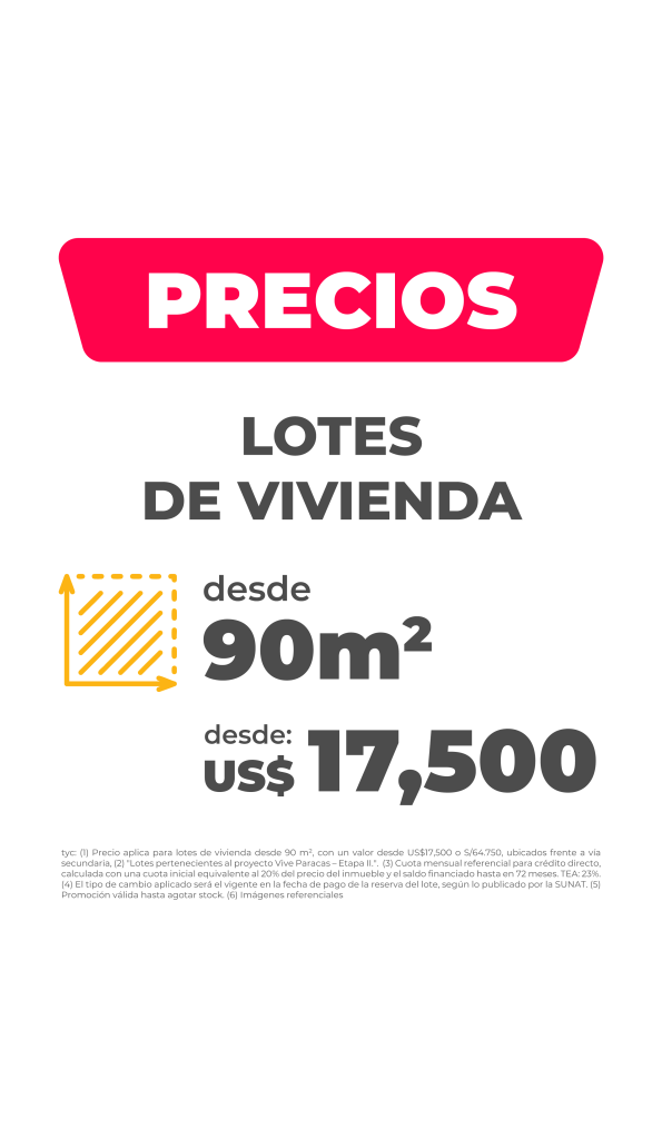 TyC: Precio aplicable para lotes de vivienda de 90 m², con un valor desde US$ 17,500 o S/ 64,750, ubicados frente a vía secundaria. Cuota mensual referencial desde US$ 343 o S/ 1,267, calculada para un lote de 90 m² con una cuota inicial del 20% y el saldo financiado hasta en 72 meses. Proyecto correspondiente a “Vive Paracas – Etapa II”. Válido hasta agotar stock. Tipo de cambio según el valor vigente en la fecha de pago de la reserva del lote, establecido por la SUNAT. Tasa Efectiva Anual (TEA): 23%. Imágenes referenciales. Marca registrada.